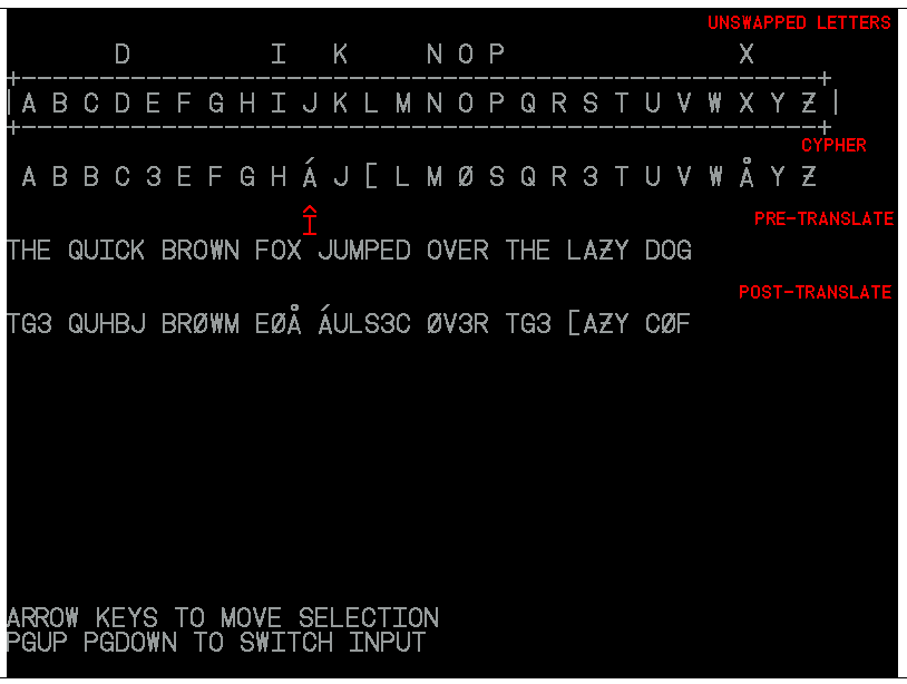 Arrow keys to move positions and shift letters. pgUp and pgDown to switch between the swap cypher, the encrypted text, and the plain text.